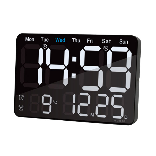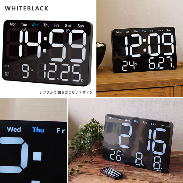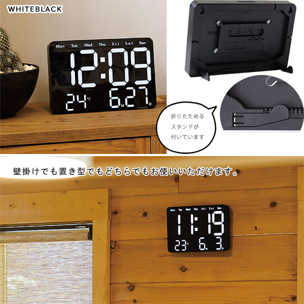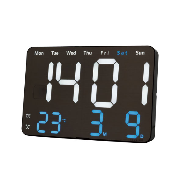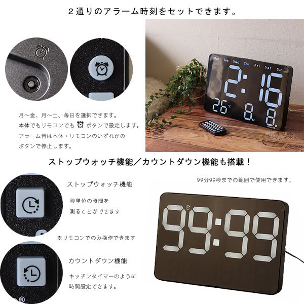 視認性を最優先した大き目のデザイン。 プライベートルームですが、パブリックスペースに設置された時計のように、みんなで時間を共有できます。 置時計としてご使用の際は、背面のスタンドを引き出せば安定感抜群です。 カウントダウンタイマー機能、ストップウォッチ機能を搭載しているので、ただの時計としてだけでなくキッチンタイマーなどとしてもご使用いただけます。 しかもリモコンが付属しているので、高い場所の壁掛け時計として使用していても全ての操作が手元で完結します! アラーム機能もついて、目覚まし時計にも♪ ディスプレイのLED輝度をお好みの明るさに調整できるのも便利。 壁掛けでも置き型でも使えるすぐれものです!
