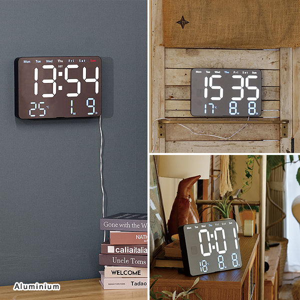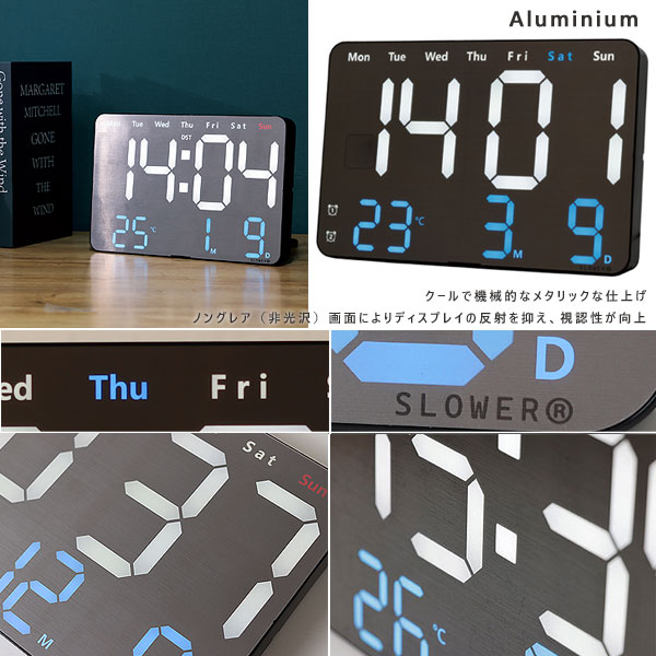 オフィスやご家庭、さまざまな場所にお使いいただけます。 12/24時間の切替も可能です。 WHITEBLACK シンプルで飽きがこないデザイン。 Aluminium アルミフェイスが特徴的。 クールで機械的なイメージを引き立てるため、メタリックな仕上げを施しました。 カレンダーと温度表示にはBLUE LEDを採用し、よりメカニカルな印象を強調。 さらに、ノングレア(非光沢)画面によりディスプレイの反射を抑え、視認性が向上しています。 基本機能の設定 時刻・カレンダー・24/12時間表示を設定します。 通常の時刻表示のときに「Set」ボタンを押します。 「+」「-」ボタンで24時間と12時間を切り替えます。 ※12時間表示のときは午後の時間に「PM」と表示されます。 「Set」ボタンで移動し「+」「-」ボタンで分を合わせます。 「Set」ボタンで移動し「+」「-」ボタンで西暦を合わせます。 「Set」ボタンで移動し「+」「-」ボタンで月を合わせます。 「Set」ボタンで移動し「+」「-」ボタンで日を合わせます。 「Set」ボタンで移動し「+」「-」ボタンで秒の点滅を指定します。 ※秒の点滅は「FLON」でON、「FLOF」でOFFになります。 「Set」ボタンで通常表示に戻ります。 上記のいずれの状態でも、8秒間放置すると通常表示に戻ります。 ※通常表示に戻るタイミングで秒がリセットされます。 リモコンでも操作可能です。
