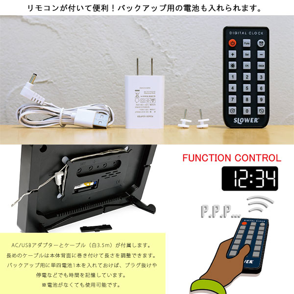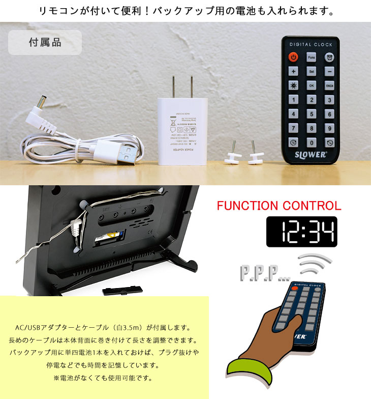 付属のUSBケーブルとAC/USBアダプターを本体に接続してください。 長めのケーブルは、本体背面に巻き付けて長さ調節できます。 背面の電池ボックスに、バックアップ用の単四電池を入れることができます。(電池別売り) 電池を入れておくと、電源を抜いたり、停電などで電源が切れた状態でも、電池が入っているときは時刻・日付を記憶しています。 ※電池がなくても使用可能です。 リモコン付きなので、手の届きにくい高い場所などに設置しても操作が簡単です。