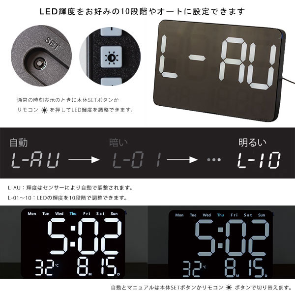 お使いのシーンによって最適な明るさに設定できますね。 オート時、暗い部屋では自動でLEDが暗くなります。 LED輝度調整 LED輝度をお好みの10段階やオートに設定できます。 通常の時刻表示のときに「太陽マーク」を押してLED輝度を調整できます。 L-AU:輝度はセンサーにより自動で調整されます。 L-01〜10:「+」「-」ボタンでLEDの輝度を10段階で調整できます。 リモコンでも操作可能です!