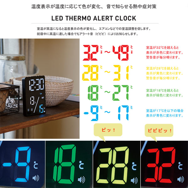 | 音と表示色により熱中症の危険をお知らせ!LEDデジタルクロック |