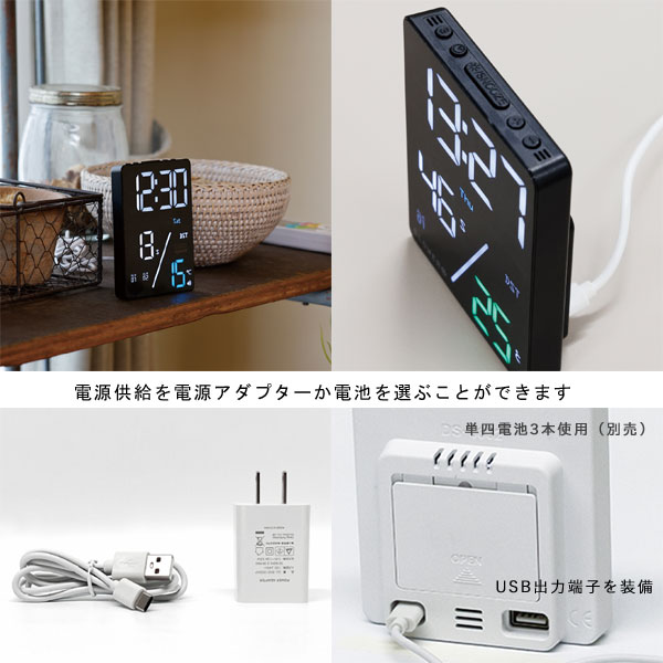 オフィスやご家庭、さまざまな場所にお使いいただけます。 12/24時間の切替も可能です。 電源供給を電源アダプタか電池を選ぶことができます。 電池でご使用の場合は、「ボタンを押したときのみ画面表示〜5秒後自動消灯」という省エネ設計! 電池は非常に長持ちします。(アダプターご使用時は常時点灯します。) 電池でご使用の場合…ボタンを押すと5秒間だけ表示します。 単四電池3本(別売)を電池ボックスに正しい方向に入れてください。 ボタンを押したときのみ画面が表示されます。 画面表示は5秒後に自動で消灯します。 ※画面が表示されていなくてもアラームなどは機能しております。 アダプターでご使用の場合…画面は常に表示されます。 付属のUSBケーブルとAC/USBアダプターを本体に接続してください。 電源を抜いたり、停電などで電源が切れた状態でも、電池が入っているときは時刻・日付を記憶しています。 背面にはスマホなどの充電に便利なUSB出力端子を装備しています。(出力5V以下、Type-A)