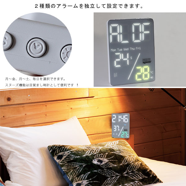 室温が高温になると、音と表示色により熱中症の危険をお知らせします。 卓上にぴったりな縦型コンパクトなクロック。 どんな場所に置いても、はっきりとしたLEDのデジタル表示で視認性もパーフェクト!調光も可能。 2種類の独立したアラーム/スヌーズを搭載していますので、ベッドサイドで寝室の温度管理にも最適。 最大出力5VのUSBアウトプットも備えていますので、お休み中にスマホなどを充電するのにも便利です。