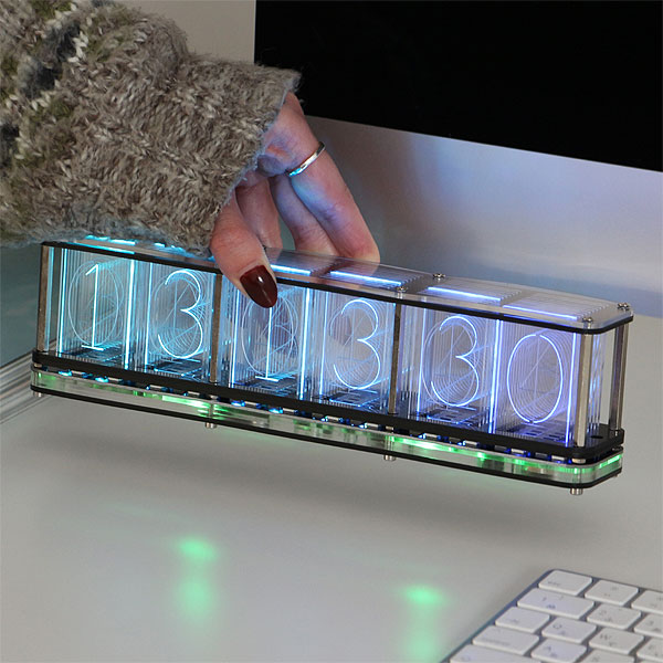 6つのディスプレイ、バックライトを組み込んだ多層アクリルで構成されており、立体的な視覚効果を生み出します。 アラーム、タイマー、ストップウォッチなどの機能を備え、 音楽スペクトラム表示機能も搭載。 また高精度DS3231クロックチップにより、正確な時間表示が可能となっています。 CR2032 ボタン電池を入れることで停電やコードが抜けても設定を保持することができます。