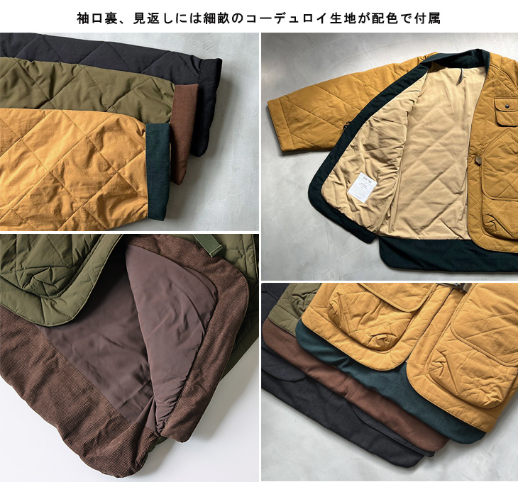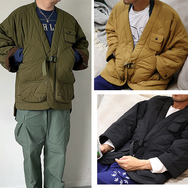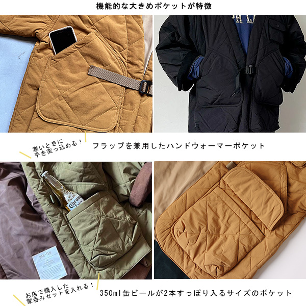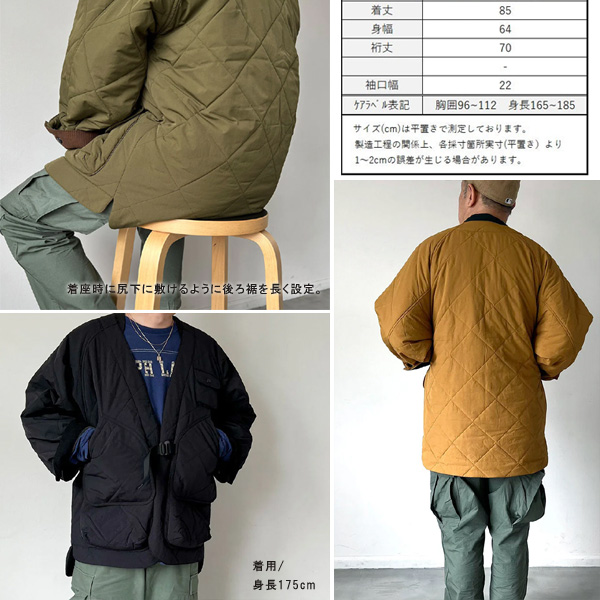 カラーはブラウン、オリーブ、ブラック。 ふんわりキルティング生地とミリタリーな色使い。トーンを合わせた裏地で整えています。 肌触りもさらっとしていて気持ちいい♪ 中綿は、GRS認証を取得した、リサイクルポリエステルわたを使用しています。 年齢男女問わず使えて現代のインテリアやライフスタイルにも取り入れやすい♪和洋問いません。 家庭での洗濯OK(ネット使用)♪清潔に冬の長いシーズンを過ごせます♪ 身長165〜185cm対応のゆったりサイズです。 ※使用ディスプレイ、撮影環境によって商品の色は見え方が多少異なりますので予めご了承願います。