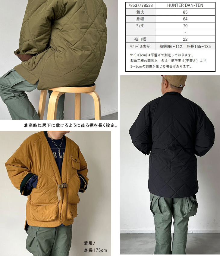 ハンティングジャケットの仕様をオマージュすることで機能的にも理想的な家呑み愛好家用DAN-TENがデザインされました。 ミリタリーテイストなデザインは性別を問わず着用でき、室内はもちろんワンマイルウェアとしても使い勝手の良い冬の羽織りです。 節電意識が高まり冬の羽織需要が高まっている今日この頃。 この冬は新しい冬の定番【DAN-TEN】を纏い、現代の半纏を着るというちょっとだけ 時別な気分を味わいながら暖かく快適に過ごしてみませんか? DAN-TEN=【暖纏:ダンテン】 日本伝統の生活着であるはんてんの形状や特徴を活かし、今のエッセンスを加えた冬の新たなスタンダードウェア。 ゆったりとした着心地、すっきりとした襟元。 重ね着しても窮屈にならないアームホール。 作業や家事がしやすい袖丈。 家で過ごす時、外に出る時もさっと羽織れる。 わたしたちの生活に寄り添いいつも心地良くあたためてくれます。