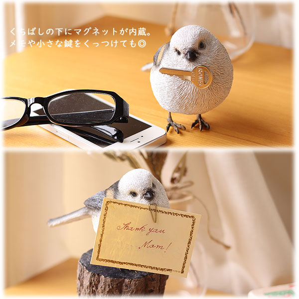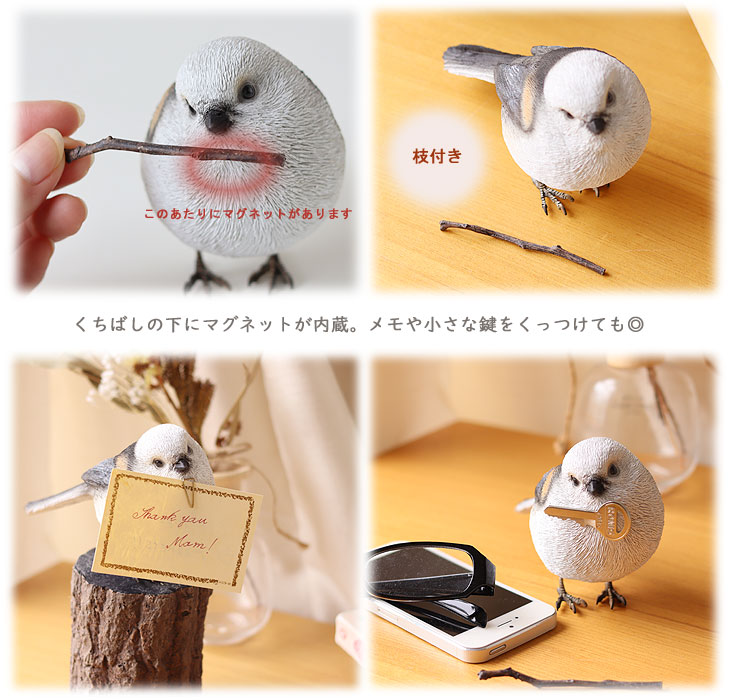 くちばしにはマグネットが埋め込まれているので、メモを挟んだクリップをくっつけてメッセージバードの代わりにしたり、玄関に飾って小さめの鍵をくっつけても便利。 一見、ものをくわえているように見える姿はとってもキュート♪