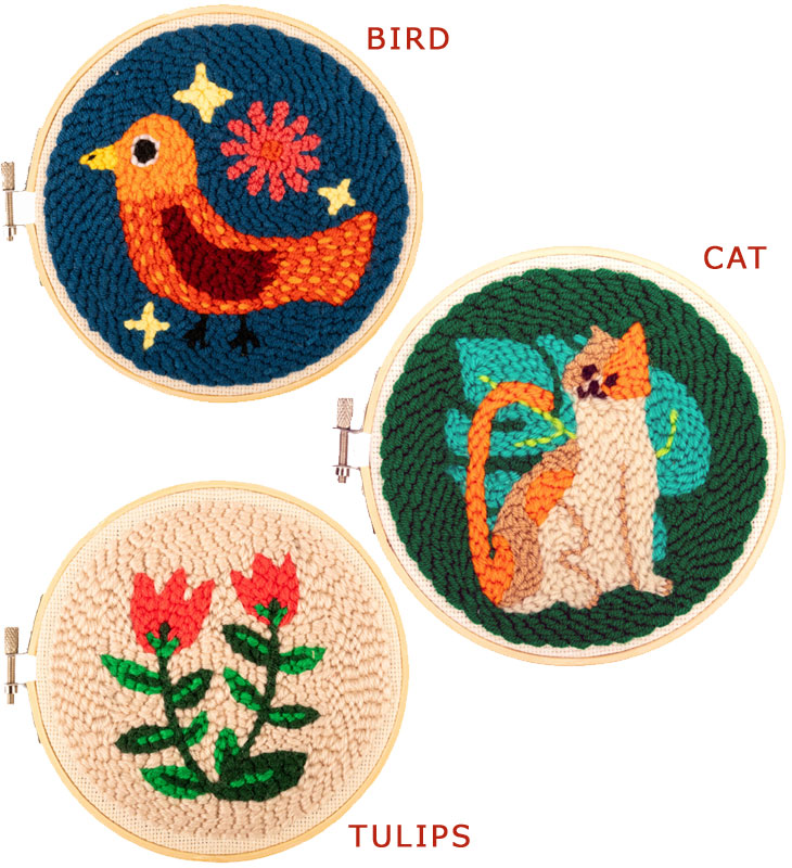 自宅や職場でリラックスしながら刺繍が楽しめるキットは、ついつい集中して時間が経つのも忘れてしまうかも♪ 15cm竹フープ、絵柄の入った刺繍用16cm角形キャンバス、カラフルな糸、糸通し器、パンチニードル1本がセットに。 パターンガイドと初心者向けのヒントも付いています! ![]() ![]() ぱきっとした色合いが印書的。インテリアのアクセントになるBIRD。 4色の糸でできるのでビギナーにおすすめ!ナチュラルインテリアにお似合いなTULIPS。 葉っぱ×ねこが新鮮でとってもキュート♪ねこ好きさんにぴったりなCAT。 ふっくらとした独特の肌触りや見た目がとにかく可愛いデザインです!