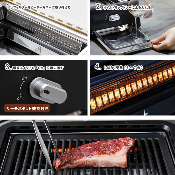 カーボンヒーターによる遠赤外線で食材を芯から温め、食材に直接火が当たりません。 そのため焦げた脂がたまらず、下部のオイルドリップトレーに落下するので煙にならない仕組みです。 ![]() 遠赤外線効果により、食材を均一に焼き上げられます。 超少煙で焼いたお肉は水分が閉じ込められ、ふわっとした食感に。2、3分経っても硬くなりません。 食材の旨みを逃がさずにおいしく仕上がります。 脂がダイレクトに水皿に落下するので、余分な脂をカットしてヘルシーにも♪