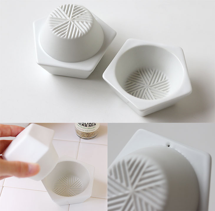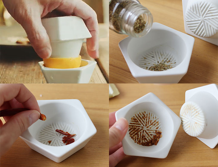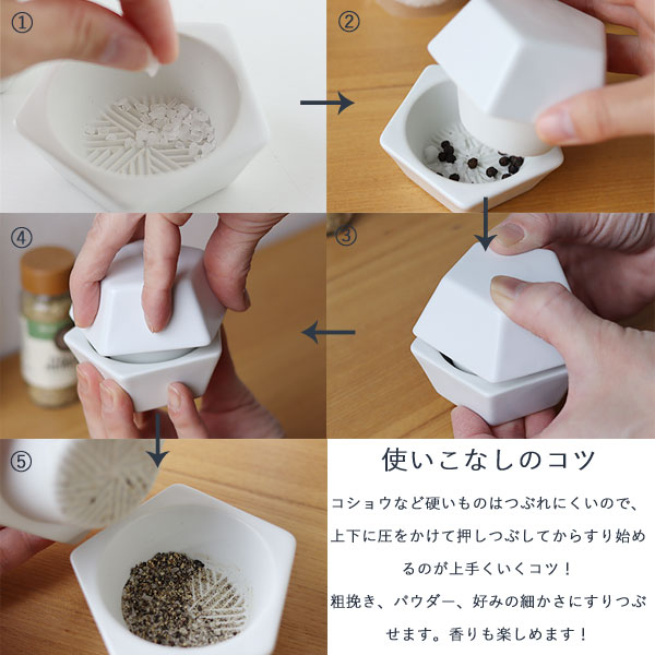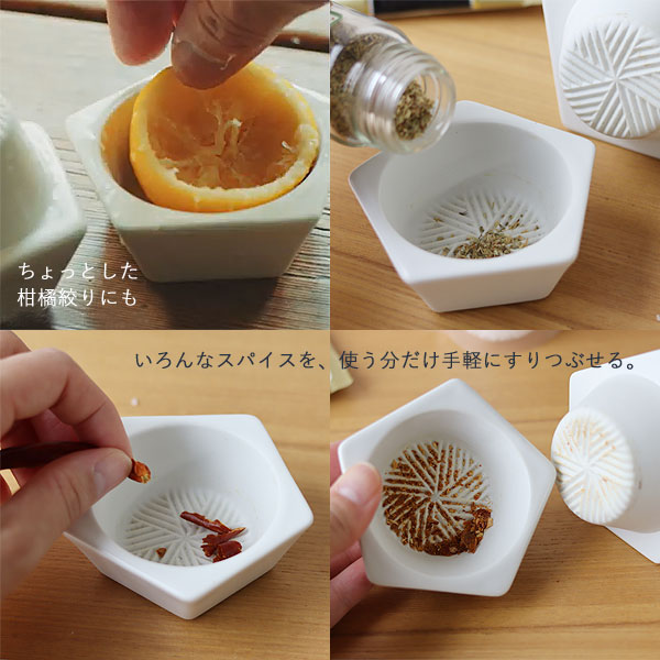 すり鉢部分にスパイスを入れてから蓋を乗せ、上から押しながらひねるようにしてスパイスをすりつぶしてください。 (力が入りにくい場合は、上から少し体重をかけるイメージでお試しください。) はじめのうちはうまくすれないかもしれませんが、徐々にいい具合に慣れてきます。 一度にたくさんスパイスを入れるとつぶれにくく上手くすれないので、少しずつ入れてください。 コショウなどの硬いものはつぶれにくいので、一度上下に圧力をかけて、音がする程度に押しつぶしてからすり始めるのがうまくいくコツです。 ※陶製ミルは、水分のある生ハーブなど葉っぱ系は苦手です。 ![]() 食×スパイスの新たなペアリングを見つける楽しさ。 カラースパイス×お肉、サラダ、クローブ×唐揚げ。 カボチャのタネ×サラダやアーモンド×お菓子、パンの生地。 山椒×うなぎ、穴子、焼き鳥、塩・胡椒×魚、お肉の下味付けや下処理などなど。 スパイスの調合を考えるのにハマるかも♪ ![]() いろんなスパイスを、使う分だけ手軽にすりつぶせるのがいいところ。 挽き立てのスパイスの香りでお料理も引き立ちます。 ちょっとした柑橘絞りにも◎ お湯とたわしだけで簡単に洗えて、いつも清潔に使えます。 お取り扱いの注意 ・直火、オーブンはご使用になれません。 ・電子レンジ、食器洗浄機はご使用になれません。 ・焼き物の底面は研磨処理を施しておりますが、テーブル等にキズが付く場合があります。引きずらないようにしてください。 ・焼き物は衝撃に弱い性質です。ぶつけたり落としたりしますと、欠け・ヒビ割れ等の破損の原因になります。破損のあるものは、ケガの原因になりますので絶対に使用しないでください。 ・ご使用後は台所用中性洗剤を柔らかいスポンジや布につけ優しく洗ってください。クレンザー、金たわしなどで強く擦ると表面にキズが付きますのでお避けください。 ・すり鉢部分の溝に残った食材が取れにくい場合は、植物性のたわしや、筆のような柔らかいものを使って取り除いてください。 ・蓋に空いている小さな穴や、蓋の上にうっすら見える円は製法上生じるもので、不良ではありません。 ・長時間の漬け置きは、穴から水が入ったり、汚れや色などが沈着したりする原因になりますのでお避けください。 ・漂白剤のご使用は、漂白剤の使用方法や説明書をよく読んでから、起債に従ってください。