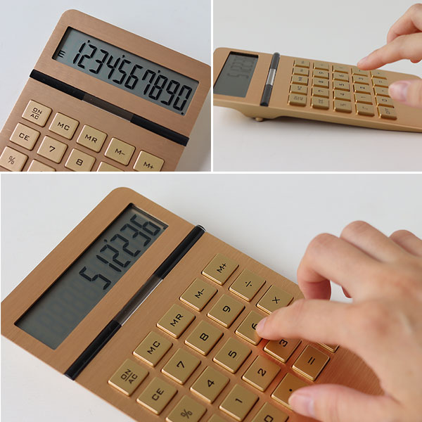 | 10桁まで表示できるゴールドのヘアライン仕上げが上品な電卓 |