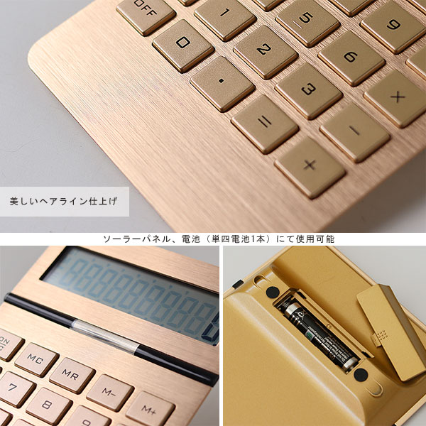 角度がついており、打ちやすく、見やすい。 表面をヘアライン仕上げにすることで、独特の質感と高級感を出しました。 光沢を抑えて落ち着いた印象に。 ソーラーパネル、電池(単四電池1本)にて使用可能です。 ※単四電池1本付属