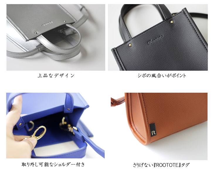シボの風合の素材で作られていているのもポイントの一つ。 フロントの下部にはROOTOTEのさり気ないロゴ付き。 ショルダーの金具部分は付け外しも簡単♪ 細かい部分にまでこだわった丁寧なつくりになっています。