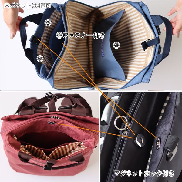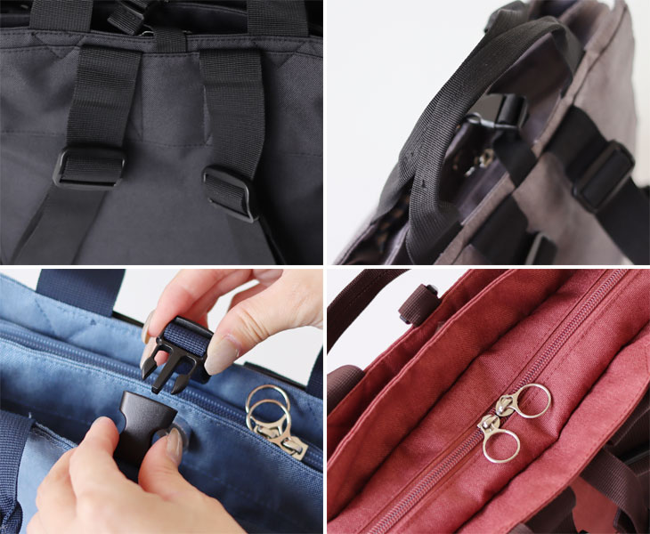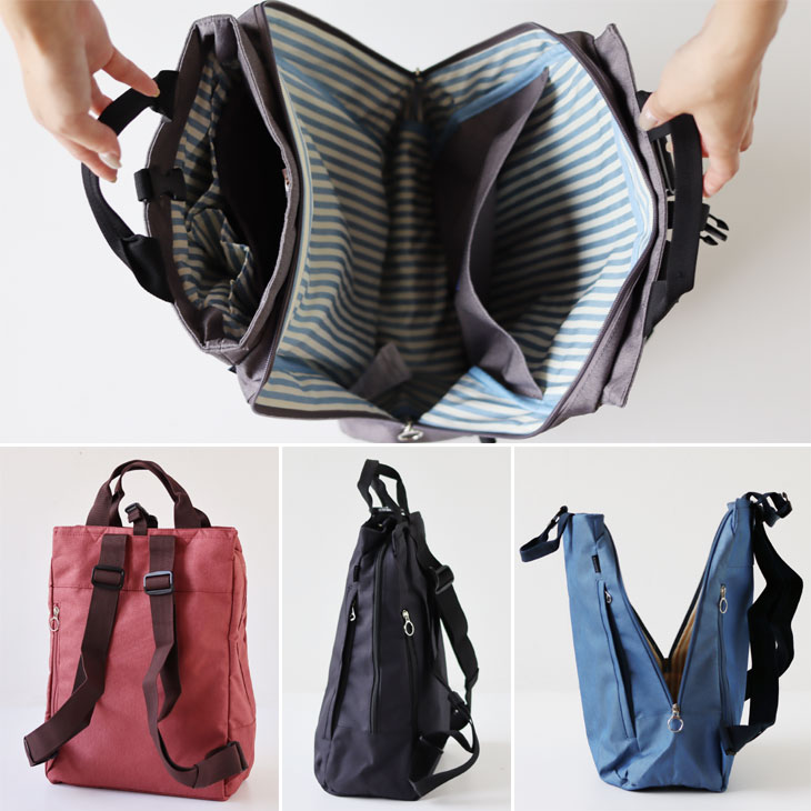 メインのスペースは2口タイプになっています。 すぐに取り出したい物、しっかりしまいたい物と分けれて、荷物の整理がしやすい♪ バッグ上部には持ち手が付いており、トートバッグとして使用することが出来ます。 背面には長さ調節可能なリュックひもが付いているので、リュックサックとしても使える2Way仕様となっています。 トートとしての使い勝手の良さはもちろん、背負ったまま、そして、前にかかえた時の快適さも追求しました。