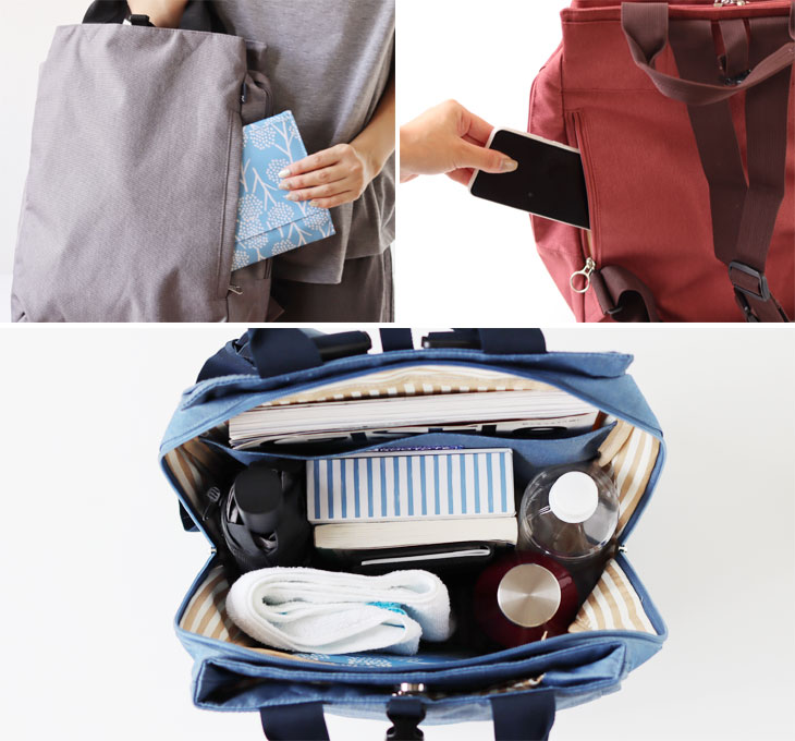 電車内で背負ったままや、前に抱えた時に、いちいちリュックを下ろさなくても簡単に荷物を出し入れできます。 どちらもファスナー付きで安心♪