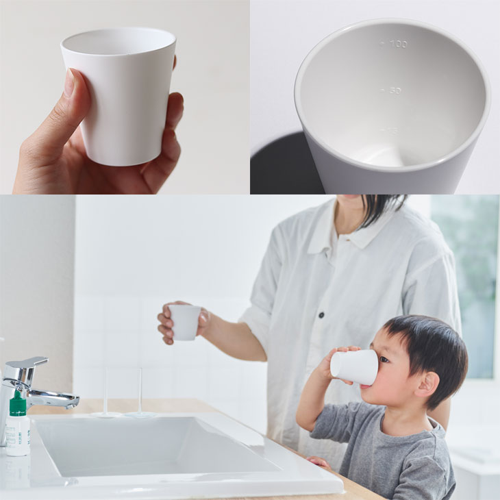 水がこぼれたときにできるような少しゆがんだ形がリアルです。 スタンド自身も支えるだけの役目から存在感が生まれ、宙には浮いていないけれど軽やかで楽しいデザインに♪ ![]() うがいにも歯磨きにも便利な目盛付き♪ コップの内側には、15ml、50ml、100mlの目盛付きです。 15mlは歯磨きの際に口をゆすぐ水量目安(5‐15mlで5秒)とされています。 50mlと100mlはうがい薬の希釈目安に便利です。 女性の方やお子様にも持ちやすい、コンパクトなサイズ感! 手軽に計量できるので、足し水などキッチンでの使用もおすすめです。