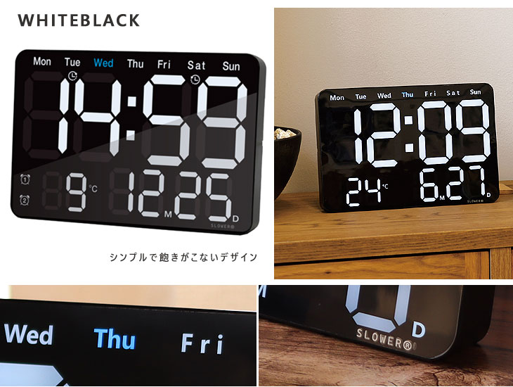 オフィスやご家庭、さまざまな場所にお使いいただけます。 12/24時間の切替も可能です。 WHITEBLACK シンプルで飽きがこないデザイン。 Aluminium アルミフェイスが特徴的。 クールで機械的なイメージを引き立てるため、メタリックな仕上げを施しました。 カレンダーと温度表示にはBLUE LEDを採用し、よりメカニカルな印象を強調。 さらに、ノングレア(非光沢)画面によりディスプレイの反射を抑え、視認性が向上しています。 基本機能の設定 時刻・カレンダー・24/12時間表示を設定します。 通常の時刻表示のときに「Set」ボタンを押します。 「+」「-」ボタンで24時間と12時間を切り替えます。 ※12時間表示のときは午後の時間に「PM」と表示されます。 「Set」ボタンで移動し「+」「-」ボタンで分を合わせます。 「Set」ボタンで移動し「+」「-」ボタンで西暦を合わせます。 「Set」ボタンで移動し「+」「-」ボタンで月を合わせます。 「Set」ボタンで移動し「+」「-」ボタンで日を合わせます。 「Set」ボタンで移動し「+」「-」ボタンで秒の点滅を指定します。 ※秒の点滅は「FLON」でON、「FLOF」でOFFになります。 「Set」ボタンで通常表示に戻ります。 上記のいずれの状態でも、8秒間放置すると通常表示に戻ります。 ※通常表示に戻るタイミングで秒がリセットされます。 リモコンでも操作可能です。