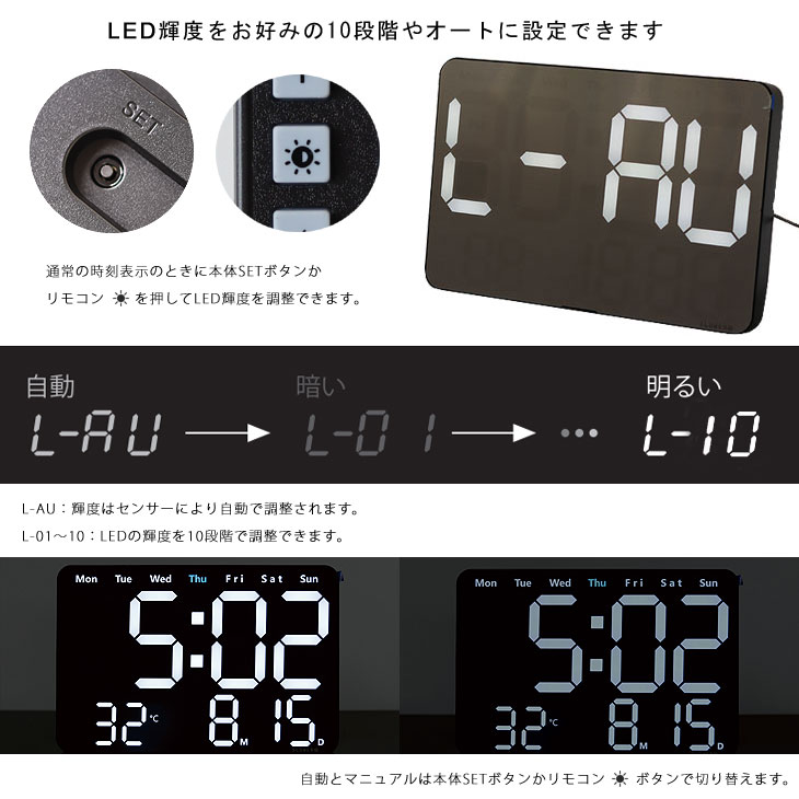 お使いのシーンによって最適な明るさに設定できますね。 オート時、暗い部屋では自動でLEDが暗くなります。 LED輝度調整 LED輝度をお好みの10段階やオートに設定できます。 通常の時刻表示のときに「太陽マーク」を押してLED輝度を調整できます。 L-AU:輝度はセンサーにより自動で調整されます。 L-01〜10:「+」「-」ボタンでLEDの輝度を10段階で調整できます。 リモコンでも操作可能です!