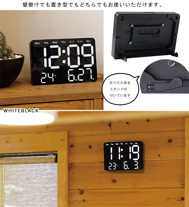 視認性を最優先した大き目のデザイン。 プライベートルームですが、パブリックスペースに設置された時計のように、みんなで時間を共有できます。 置時計としてご使用の際は、背面のスタンドを引き出せば安定感抜群です。 カウントダウンタイマー機能、ストップウォッチ機能を搭載しているので、ただの時計としてだけでなくキッチンタイマーなどとしてもご使用いただけます。 しかもリモコンが付属しているので、高い場所の壁掛け時計として使用していても全ての操作が手元で完結します! アラーム機能もついて、目覚まし時計にも♪ ディスプレイのLED輝度をお好みの明るさに調整できるのも便利。 壁掛けでも置き型でも使えるすぐれものです!
