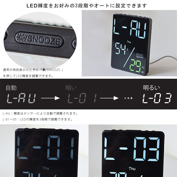 お使いのシーンによって最適な明るさに設定できますね。 LED輝度調整 LED輝度をお好みの3段階やオートに設定できます。 通常の時刻表示のときに「SNOOZEマーク」を押してLED輝度を調整できます。 L-AU:輝度はセンサーにより自動で調整されます。 L-01〜03:LEDの輝度を3段階で調整できます。