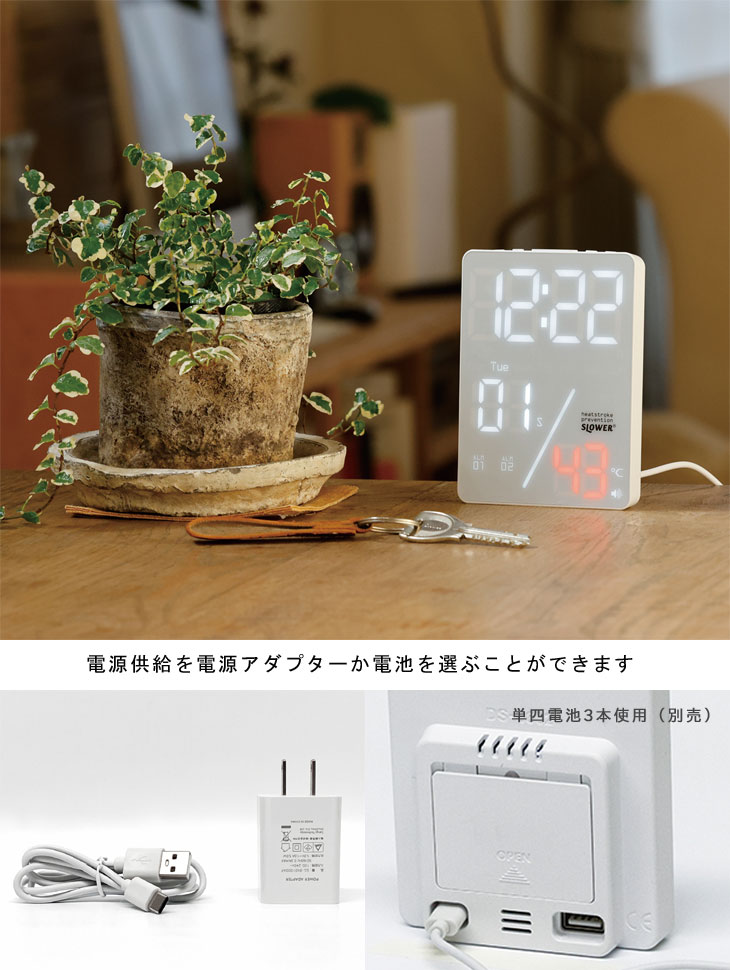 オフィスやご家庭、さまざまな場所にお使いいただけます。 12/24時間の切替も可能です。 電源供給を電源アダプタか電池を選ぶことができます。 電池でご使用の場合は、「ボタンを押したときのみ画面表示〜5秒後自動消灯」という省エネ設計! 電池は非常に長持ちします。(アダプターご使用時は常時点灯します。) 電池でご使用の場合…ボタンを押すと5秒間だけ表示します。 単四電池3本(別売)を電池ボックスに正しい方向に入れてください。 ボタンを押したときのみ画面が表示されます。 画面表示は5秒後に自動で消灯します。 ※画面が表示されていなくてもアラームなどは機能しております。 アダプターでご使用の場合…画面は常に表示されます。 付属のUSBケーブルとAC/USBアダプターを本体に接続してください。 電源を抜いたり、停電などで電源が切れた状態でも、電池が入っているときは時刻・日付を記憶しています。 背面にはスマホなどの充電に便利なUSB出力端子を装備しています。(出力5V以下、Type-A)