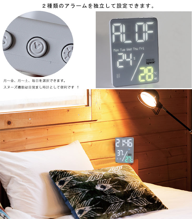室温が高温になると、音と表示色により熱中症の危険をお知らせします。 卓上にぴったりな縦型コンパクトなクロック。 どんな場所に置いても、はっきりとしたLEDのデジタル表示で視認性もパーフェクト!調光も可能。 2種類の独立したアラーム/スヌーズを搭載していますので、ベッドサイドで寝室の温度管理にも最適。 最大出力5VのUSBアウトプットも備えていますので、お休み中にスマホなどを充電するのにも便利です。