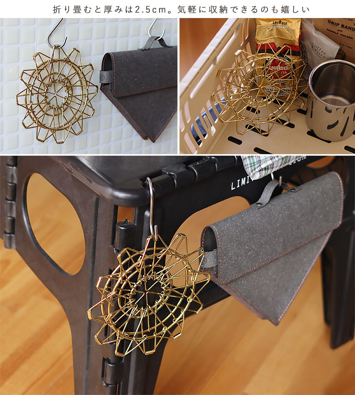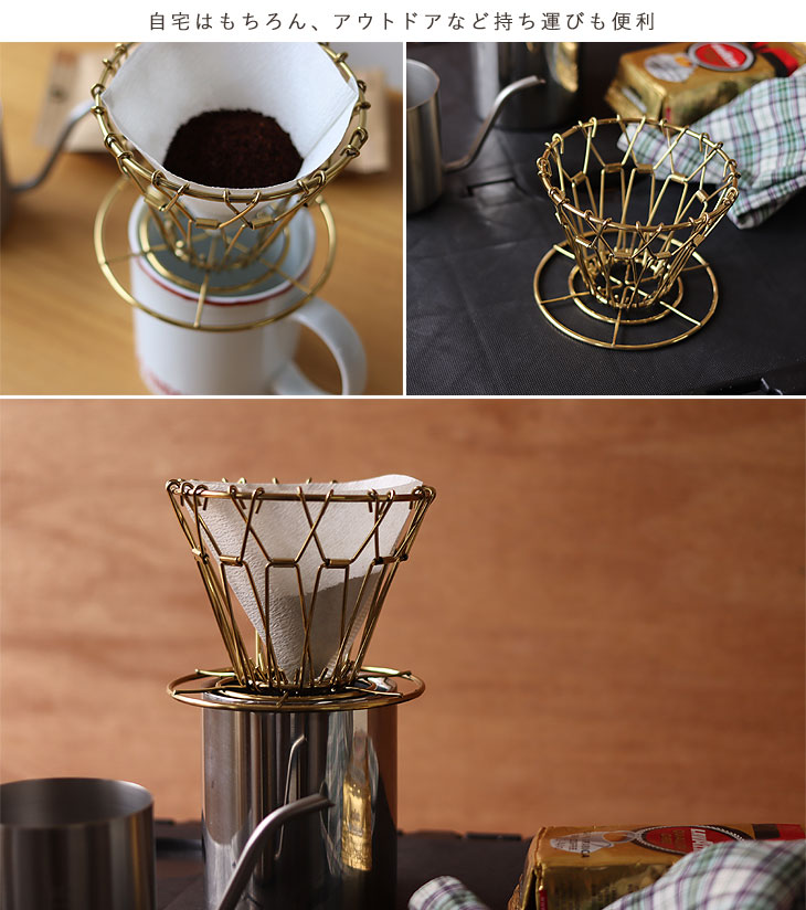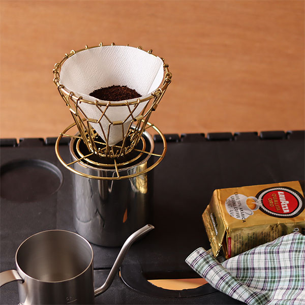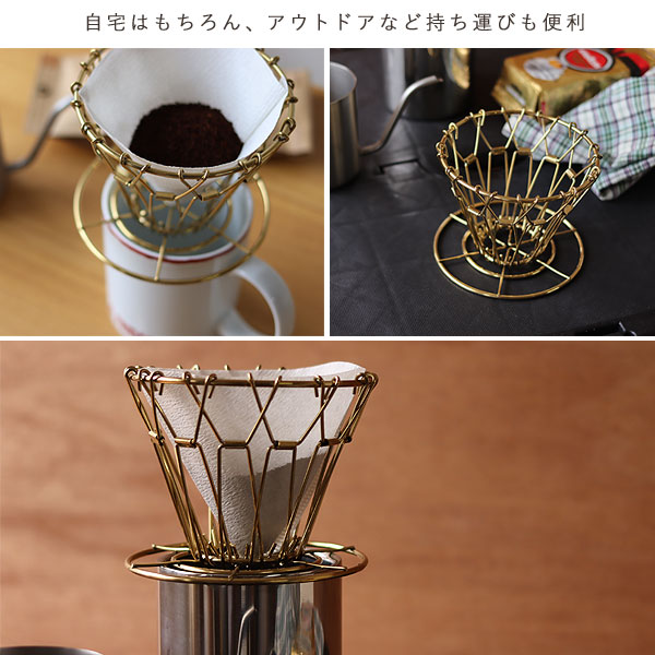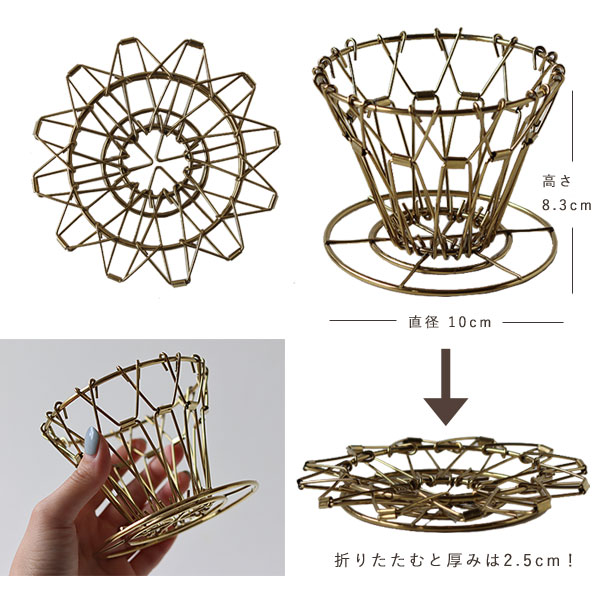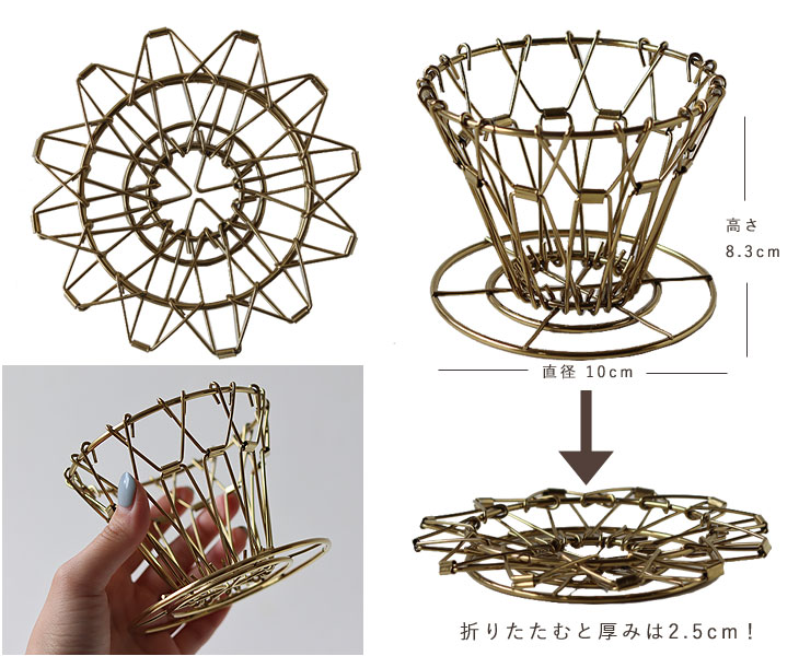 | コンパクトに折り畳んで収納できるゴールドコーヒードリッパー |