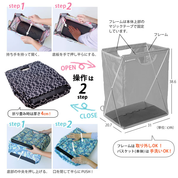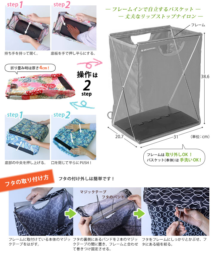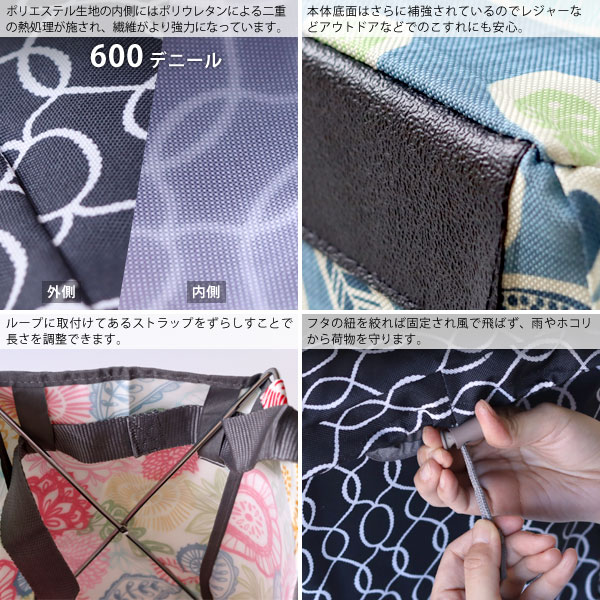 内側にフレームが付けた丈夫で自立できる3way使用のマイバスケット「パックバスケット」。 デザイン化された模様が印象的なプリント地が日常を華やかなものにしてくれます。 汚れたら洗える!用途に合わせて持ち方も変えれる!使い幅のある便利なバスケット♪ レジャーに、ピクニックに、庭の手入れから仕事道具としても活用いただけます。 フタをかければ雨やホコリも入らない!取り外しも簡単! バスケットはフラットに折りたためて、その厚さはたった4cmです。 すきまに収納ができるので、車に積んでも場所はとりません。 使うシーンに合わせてストラップの長さを調整すれば手持ちにもショルダーにも対応。 肩掛けで使用すれば手が使えて便利!作業もはかどります。 ストラップを使わなくても、フタをしたままでも、本体の持ち手で運ぶことができます。 マルチコンテナとして仕事道具や災害用品の収納にもおすすめです。