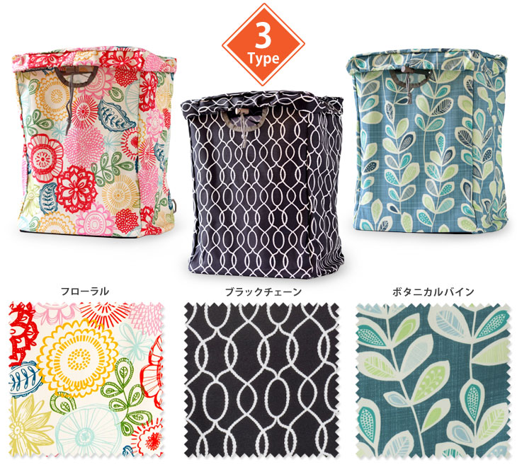 プリント地は3タイプ。 デザイン化された模様は見ていて飽きず、男女問わず使えるプリント地となっています。 ・フローラル:カラフルな暖色系の花や植物がちりばめられて楽しい気分にしてくれます。 ・ブラックチェーン:モノトーンのチェーン模様がシンプルなデザイン。 ・ボタニカルバイン:植物の模様が広がり自然の優しさを感じます。 丈夫な素材(600デニール!)でしなやかで水にも強いポリエステル生地です。 生地はごわごわしておらず、さらっとしたしなやかな触り心地です。