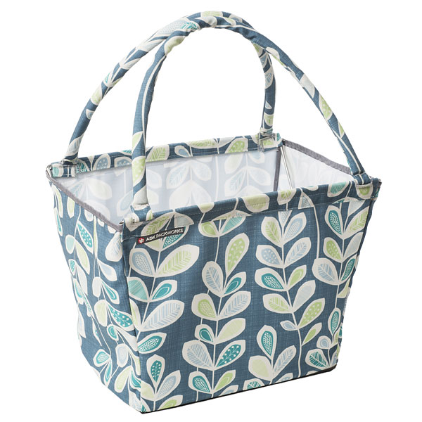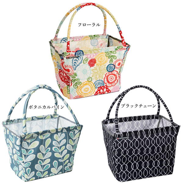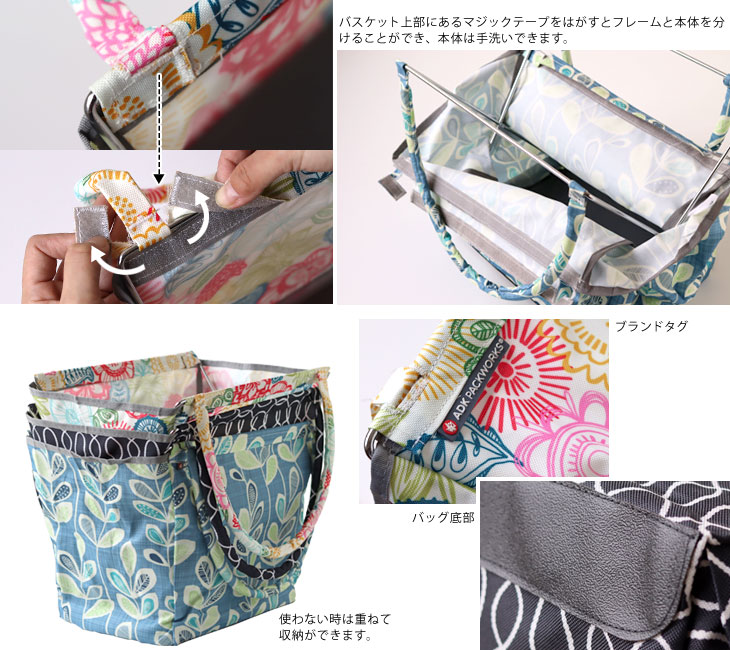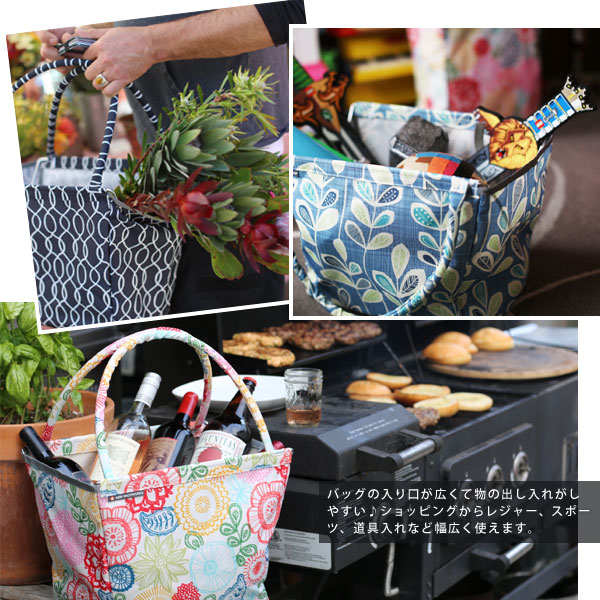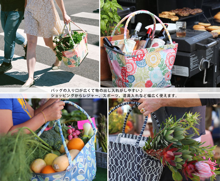 内側にフレームが付けた丈夫で自立できるお買い物バッグ「マーケットバスケット」。 日常のお買いものに便利なレジカゴサイズのバスケットです。 デザイン化された模様が印象的なプリント地が日常を華やかなものにしてくれます。 モダンなデザインですがレトロ感も感じられる楽しい柄になっています。 汚れたらフレームを取り外して本体は洗えるので清潔に保てます♪ フレームで強度のある作りなので食材だけでなくBBQ道具をざっとまとめるのにも便利! レジャーに、ピクニックに、庭の手入れから仕事道具としても活用いただけます。 バスケットはフラットに折りたためば、車に積んでも場所はとりません。 マルチコンテナとして仕事道具や災害用品の収納にもおすすめです。ひとつあると便利ですね。