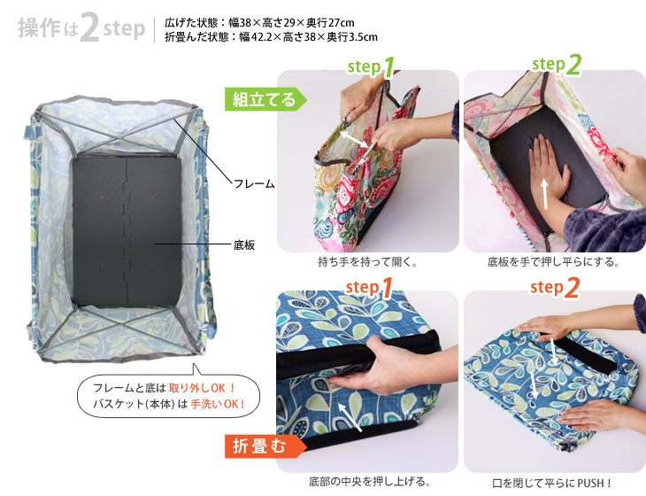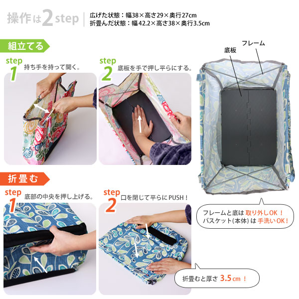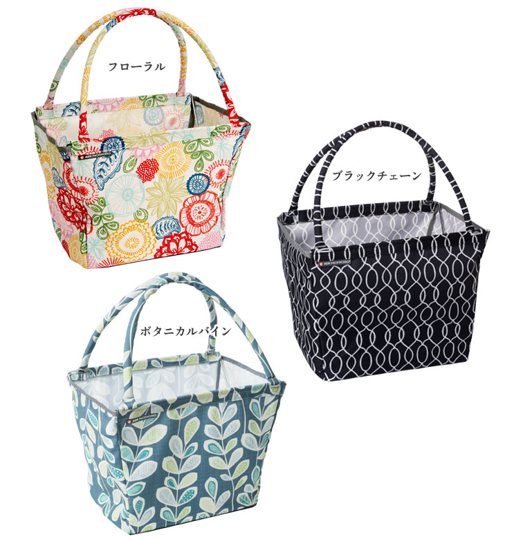 バッグ本体には厚みのある底板が付いたフレームが取付けてあり、自立することができます。 荷をしっかり支えてくれるので、安定して持ち運ぶことができます♪ 底板を畳むことでフラットにすることができて、操作も2ステップ!簡単です! [操作は簡単!2ステップ>>>組み立てる] 1ステップ:バッグ上部の持ち手を押さえながら丁寧にフレームを開きます。 2ステップ:バッグの内側から底板を押さえて平らにします。 [操作は簡単!2ステップ>>>折りたたむ] 1ステップ:バッグ外側から底部の中央を押し上げます。 2ステップ:バッグの口を閉じて平らに押さえます。