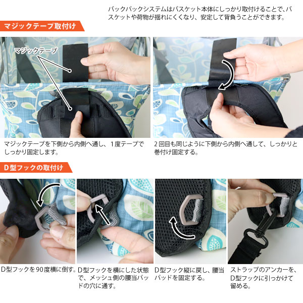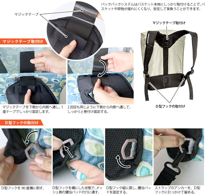 バックパックのアクセサリーはバックバスケット本体のD型フックのある側に取付けます。 上部にあるバッグ本体の持ち手箇所と下部に左右2ヵ所あるD型フックの3点を取付けます。 [上部:マジックテープ取り付け方法] 1.マジックテープを下側から内側へ通し、1度テープでしっかり固定します。 2.2回目も同じように下側から内側へ通して、しっかりと巻付け固定する。 ※必ず2回しっかりと巻き付け固定してください。 [下部:D型フックの取り付け方法] 1.D型フックを90度横に倒す。 2.D型フックを横にした状態で、メッシュ側の腰当パッドの穴に通す。 3.D型フック縦に戻し、腰当パッドを固定する。 4.ストラップのアンカーを、D型フックに引っかけて留める。 背負った状態でパーツ前部にあるストラップを下に引くことでお好みの長さに調整できます。 ゆるめる時はストラップ調整パーツを軽く上に持ち上げることでストラップが緩みます。 重い荷物を運ぶ時などは肩紐がしっかりフィットさせることをおすすめします。 D型フックを腰当パッドに取付けて縦の位置にもどすことで外れにくい設計となっています! バスケットとバックパックのパーツを密着させることがポイント! バスケット自体や荷物が揺れ動くことをふせぎ安定して運ぶことができます。
