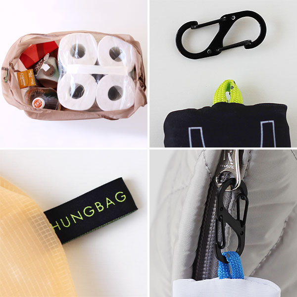 HUNGBAGは水をはじきやすい加工が施され、機能的で軽量なリップストップナイロンを使用しています。 また菌やウイルスなど気になる汚れに対応し洗濯も可能です。 カラビナは取り外すことができます。 洗濯する際は、カラビナを外して単独洗いをして下さい。 耐荷重は10kg! コンビニ商品で最大クラスのサイズとなるトイレットペーパー12ロールパックの購入を想定したエクストララージ。 また、食品、日用品など買い物が多種になるときに便利なHUNGBAG最大サイズです。