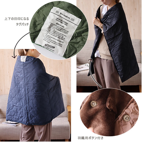 上半身がすっぽり覆え、男性でも腰に巻けるサイズ感です。 裏地はそれぞれ表面と同カラーの、保温性が高いフランネル生地。 毛布のような、温かくふんわりとした肌触りがとっても気持ちいいですよ。 羽織用のボタンが付いているので、肩にかけても落ちにくく、両手が使えます。 ひざに掛けているときも、後ろでボタンを留めておけばずり落ち防止に♪ 上部真ん中にはロゴパッチが付いているので、上下が分かりやすい! おしゃれなワンポイントにもなっています。