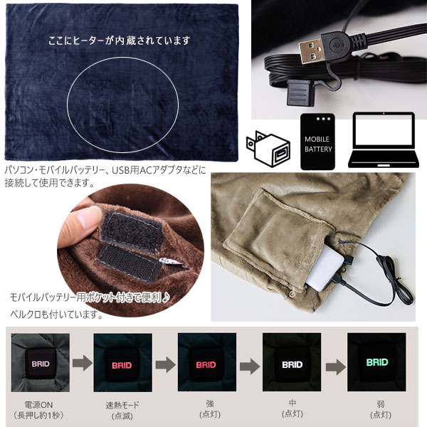 モバイルバッテリーやUSB用ACアダプタ、パソコンなどに接続して使用できます。 温度調節ができ、2時間自動OFFタイマーも付いていて便利! モバイルバッテリーを収納できるポケット付き!コードやバッテリーが邪魔になりません。 ベルクロ付きで落下することなく安心です。 使用方法 1.USBコネクターをUSB充電器またはUSBバッテリーに差し込みます。 2.電源を入れます。 電源・温度調節ボタンを長押し(約1秒)するとランプがつき、暖房運転を開始します。 電源を入れた後、2時間経過すると自動的に運転が停止します。(2時間自動OFFタイマー) 3.温度調節を設定します。 電源・温度調節ボタンを押すごとに温度調節が下記の順で温度が切り替わります。 電源ON→速熱モード(点滅:赤ランプ)→強45度(点灯:赤ランプ)→中40度(点灯:白ランプ)→弱32度(点灯:緑ランプ) ※電源ON後の温度設定は「速熱モード」です。 「速熱モード」とは、10分間、温度を「強」より高めになるように設定しております。 10分後に「強」へ自動的に切り替わります。 4.使用後、電源を切ります。 電源・温度調節ボタンを長押し(約1秒)するとランプが消え、暖房運転が停止します。