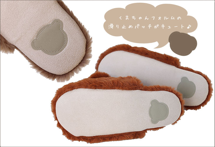 ![]() 内側も全面ふかふかのフェイクファー生地で作られたルームスリッパ。 ファーのボリュームもたっぷりです。 フェイクファー素材で、冷える足元を温めてくれますよ。 ![]() 底面はフローリングにも優しい仕様になっています。 かかと部分には、くまちゃんフォルムの滑り止めパッチが♪ 見えないところもさりげないこだわりです。 ![]()
