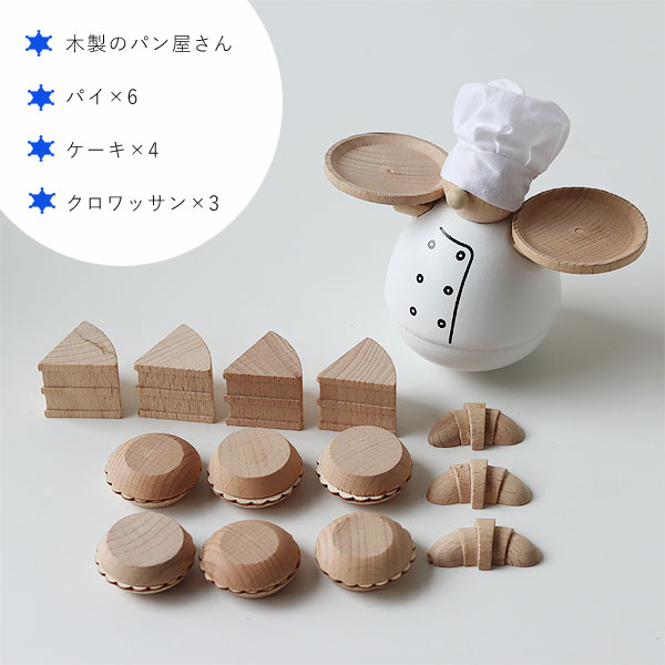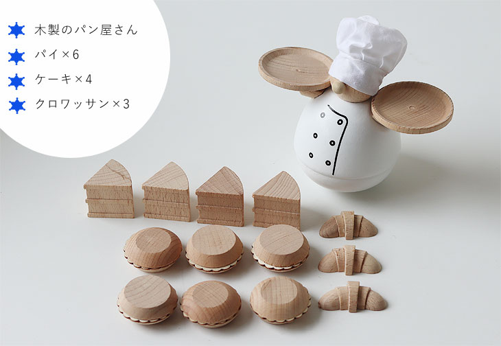 木製のパン屋さん×1、パイ×6、ケーキ×4、クロワッサン×3のセット。