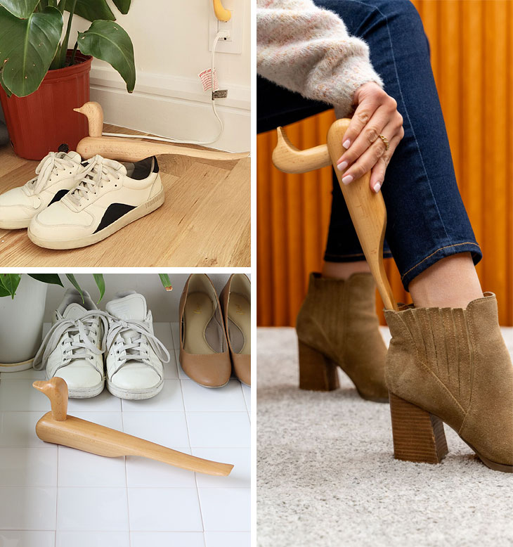 | アヒルの形をしたオブジェのようなかわいい木製の靴べら |