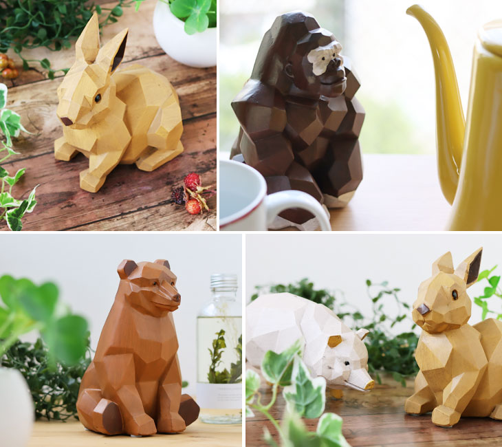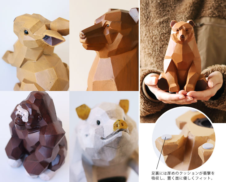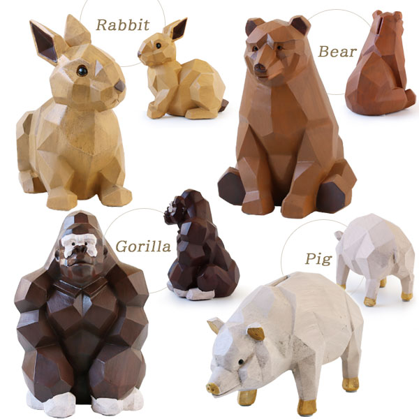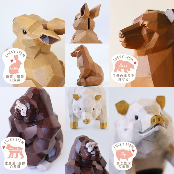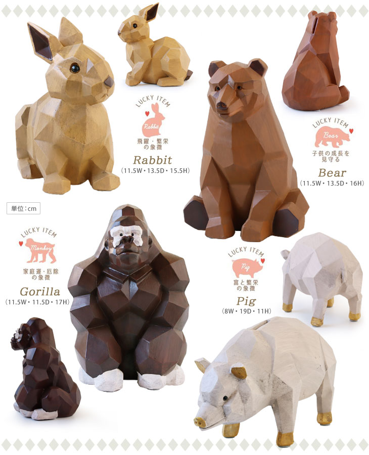 子供部屋には見守りを、新社会人はこれからの成長を。 家族が幸せに生活できるようリビングには家庭運、店舗や仕事場には商売繁盛を考えて。 動物たちはそれぞれラッキーアイテムとして意味を持っています。 [Rabbit] 長い耳がぴん!くりくりの目は好奇心でいっぱい。 ラッキーアイテム◎飛躍・繁栄の象徴 [Bear] 足を突き出してどんと腰をおろした姿がキュートなおっとり熊さんかな? ラッキーアイテム◎子供の成長を見守る [Gorilla] もりあがった腕の筋肉が頼もしい♪頼りたくなっちゃいますね。 ラッキーアイテム◎家庭運・厄除けの象徴 [Pig] やっぱり豚さんの貯金箱!ポイントにゴールドカラー入っています! ラッキーアイテム◎富と繁栄の象徴 ラフに面取りされて作られた動物の表面は光の当たり方や身体の向きで表情が変わるのが楽しい。 さまざまなインテリアタイプに馴染みやすいアート感のある作りになっています。
