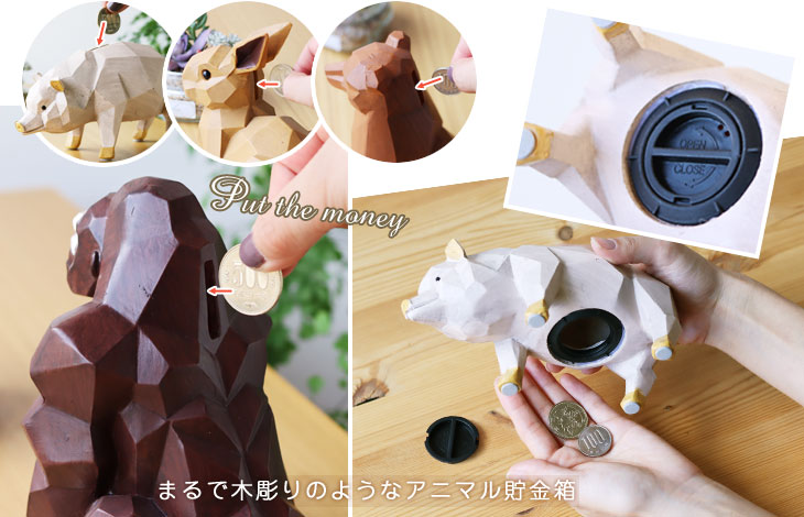 置くだけでほっこり癒してくれる木彫り風のアニマルモチーフ貯金箱「スオーラ」。 ぬくもりのある木目調が北欧風のインテリアにも馴染んでくれます。 本体はポリレジンという素材からできていますが、まるで木のような質感です。 かわいいインテリア小物とういだけありません!貯金箱にもなる実用性も◎ お金は取り出し口から簡単に出すことができるから本体を割る必要はありません。 繰り返し続けて使うことができるのはうれしい♪置くだけで笑顔にしてくれるスオーラ。 小さな幸せも一緒に貯まる♪かわいい木目調のアニマル貯金箱です。