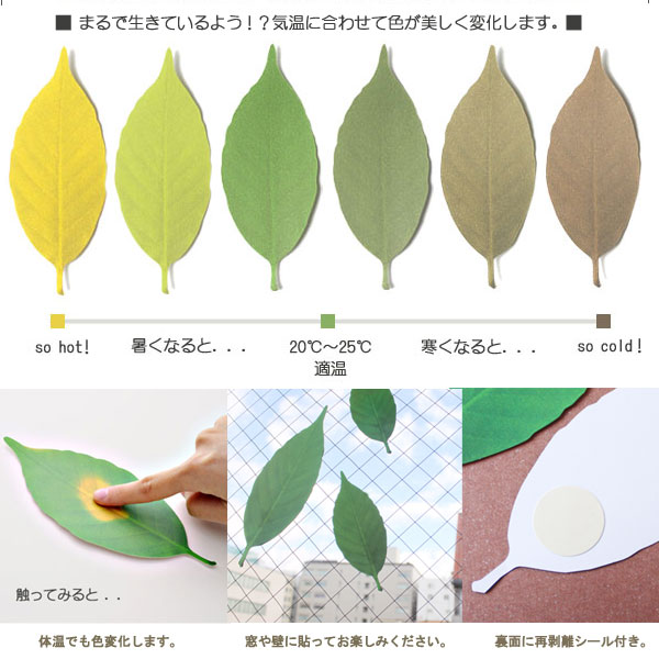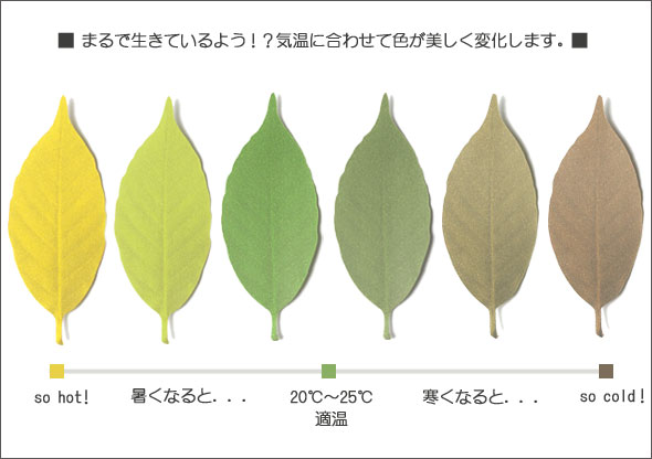 ![]() リーフは色で感じる不思議な温度計です。20〜25度程度の時はきれいな緑色をしていますが、 寒くなってくると緑から黒に近い焦げ茶色へ、暑くなってくると黄色へと、徐々に変わっていきます。 それはまるで自然界での四季の移ろいを見ているよう。自然の温もりを感じられる愛らしいLeafを ドアや壁に貼って、お部屋にいながら四季折々の変化をお楽しみください。 ![]() 20〜25度の適温では鮮やかな緑色に。寒くなると秋冬らしい茶色、暑くなると明るい黄色に変化していきます。 毎日の気温チェックが楽しみになりそうですね。