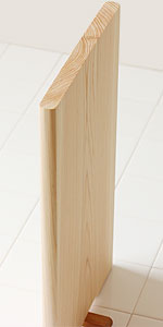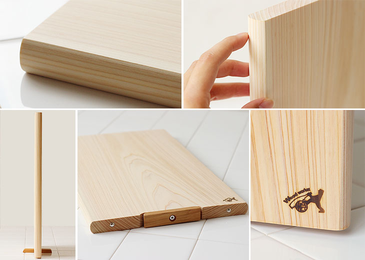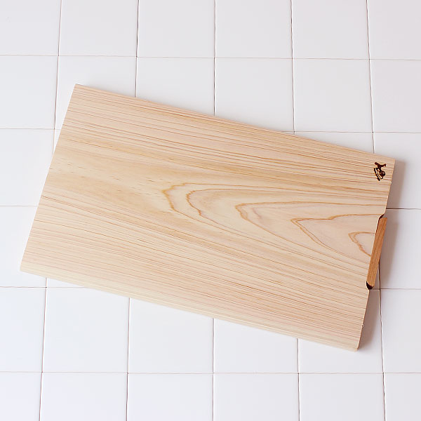 | 包丁の刃先にやさしい檜製、角の丸い柔らかな形のまな板 |