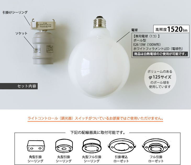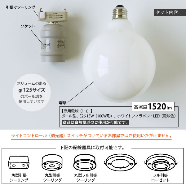 このシーリングライトには傘はなくシンプルに電球とソケットだけなので0.25kgと軽量です。 ワンタッチで天井にある配線器具に付け外しできるのでカンタン! 直径12.5cmの大きなホワイトフィラメントLED電球のボール球を使用しています。 この存在感のある大きさの電球は天井に取付つけただけでインテリアとして楽しめます。 灯りがともると電球色の暖かく落ち着いた光が部屋に広がります。
