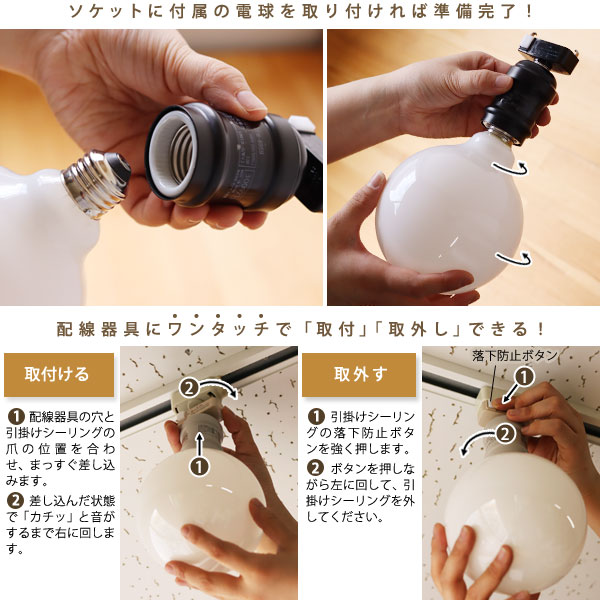 組み立てはソケットに電球を回してとりつけれるだけ。 天井の配線器具への「取付」「取外し」はワンタッチで簡単です! ※電球は締めすぎないようにご注意ください。 ※確実にソケットに差し込んでください。 ※ライトコントロール(調光器)スイッチがついているお部屋ではご使用いただけません。 作業前に必ず電源を切ってから行ってください。 (ライト本体にはスイッチはありません。) 【天井の配線器具に取付ける】 1.配線器具の穴と引掛けシーリングの爪の位置を合わせ、まっすぐ差し込みます。 2.差し込んだ状態で「カチッ」と音がするまで右に回します。 【天井の配線器具に取り外す】 1.引掛けシーリングの落下防止ボタンを強く押します。 2.ボタンを押しながら左に回して、引掛けシーリングを外してください。 ◎付属のLED電球とは異なるサイズや形状の電球に交換される場合は下記のものをお選びください。 ・白熱電球:E26、60W以下 ・LED電球:E26、白熱電球100W相当以下 ※LED電球は性能によって白熱電球相当表jの明るさに満たないものがございます。