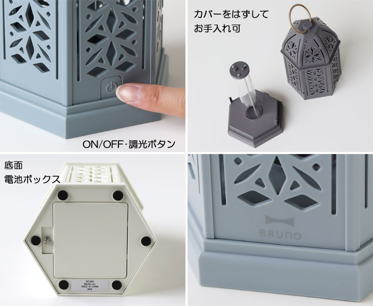 単3乾電池4本でご使用いただけます。(電池は別売りとなります) おなじみのBRUNOのブランドロゴは側面にさりげなく。 本体のカラーに合わせたパッケージボックス入り、 やわらかくてあたたかな光と影で作り出すリラックス空間、癒しの時間をプレゼントするのもおすすめです♪ 【ご使用方法・お手入れ方法】 ・スイッチをタッチするとランタンが点灯します。点灯している状態からスイッチを再度タッチすると消灯します。 ・ランタンが点灯している状態でスイッチを長押しすると、調光できます。お好みの明るさになったらスイッチから手を 放してください。 ・本体カバーは取り外して洗うことができます。毛先の柔らかいブラシやスポンジで水洗いしたあと、乾いた柔らかい布で 水分を拭き取ってください。 ・本体(ライト部分)にほこりや汚れなどが付着した場合は、水を含ませた布で拭き取ってください。 |