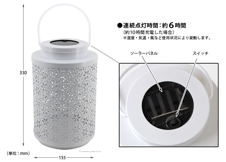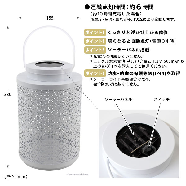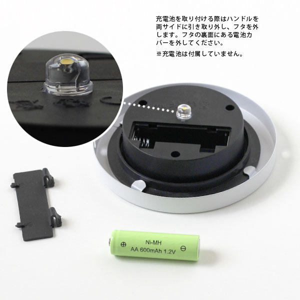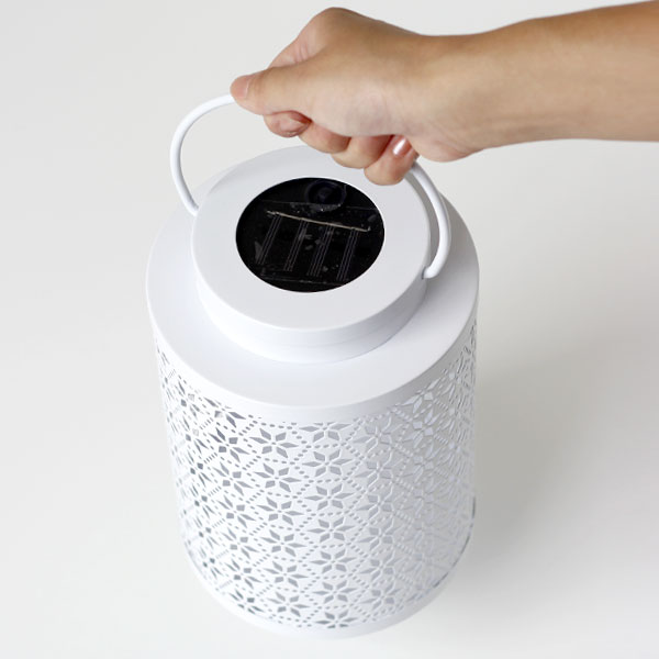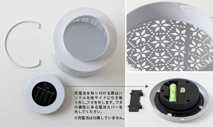 使い方はカンタンです!充電池をセットしてスイッチをONにするだけ♪ 日中はソーラーで充電、暗くなると自動点灯、明るくなると自動消灯とランタンおまかせでOKです。 灯りだけでなく模様が周囲に広がり、さらにムードある空間を演出してくれるのはうれしいですね♪ リラックス効果で仕事の疲れを癒してくれます。 充電池は付属していません。 単3形ニッケル水素充電池(1.2V 600mAh以上のもの)1本を購入・使用してください。 ハンドルは片方ずつを引き抜くと外しやすいです。 [充電池交換方法] 1)ハンドルを両サイドに引き取り外しフタを外します。 2)フタの裏面にある電池カバーを外して電池を交換してください。 ※約10時間の充電で約6時間点灯します(湿度・気温・風など使用状況により変動します)。 ※電源をON時にのみ充電します(ソーラー部分を手で隠した状態で点灯すればONの状態です)。 ※乾電池(アルカリ・マンガンなど)は使用しないでください。 ※発熱、液漏れ、破損の原因になるので、充電池の+と−の方向を正しく入れてください。