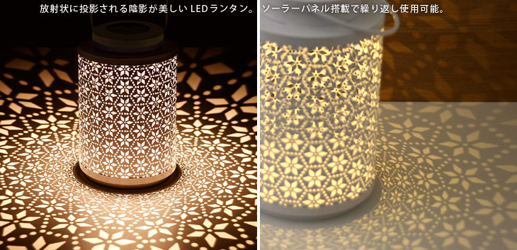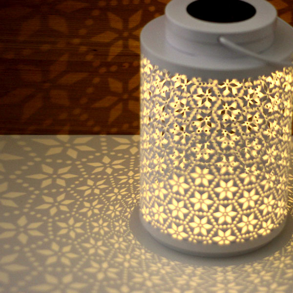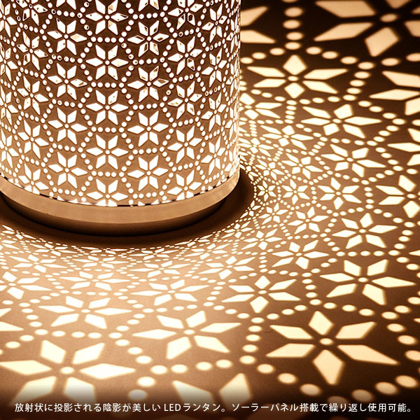 放射状に投影される陰影が美しいLEDランタンです。 ソーラーパネル搭載で繰り返し使用いただけます。 周囲の明るさで自動点灯・自動消灯で手間がかかりません。 花畑が広がるような美しい模様が広がり華やかな空間に。