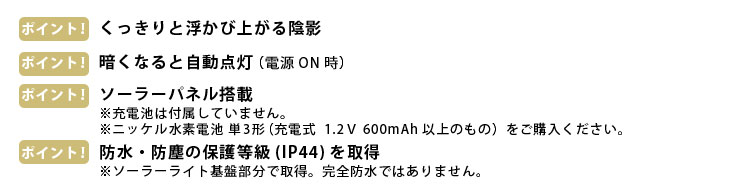 [ご使用について] ・初めて使用する際は電源をONにしてから、ソーラーパネルを直射日光に当てて十分な充電を行った上で使用してください。 ・電源はスイッチを押して、ソーラー部分を手で隠して暗くした場合にライトがつけばONの状態です。 ・ニッケル水素電池の特性上、数回充電することで基準の点灯時間に近づきます。 ・十分な充電をした後でも光が弱かったり、すぐに消える場合は充電池の交換時期です。 ・電気部品の損傷や故障の原因になるので、ストーブの近くや火の気のある場所、炎天下の車内など、高温になる場所での使用や保管をしないでください。 ・小児やペットの手の届かない所で使用、保管してください。 ・完全防水ではありませんので、湿気の多い場所で使用したり、水につけたり、雨や水滴がかからないようにしてください。 ※点灯時間、光の明るさは使用する地域、設置場所、季節や天候の日照条件に左右されます。くもりの日が続くと電池残量が少なくなり、ライトが暗くなったり点灯時間が短くなることがあるので、その場合は直射日光に長時間当てて充電を行ってください。 |