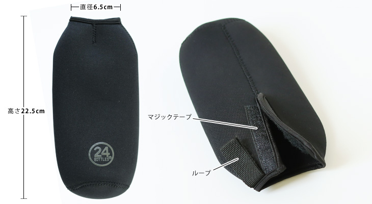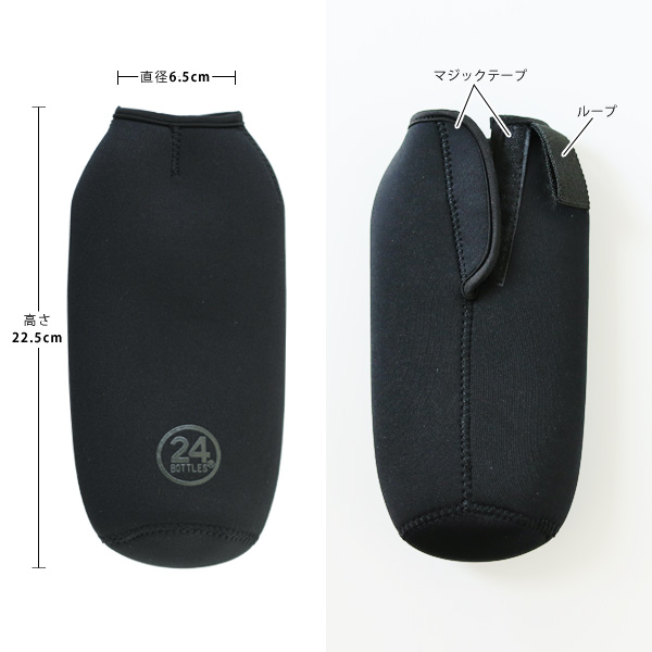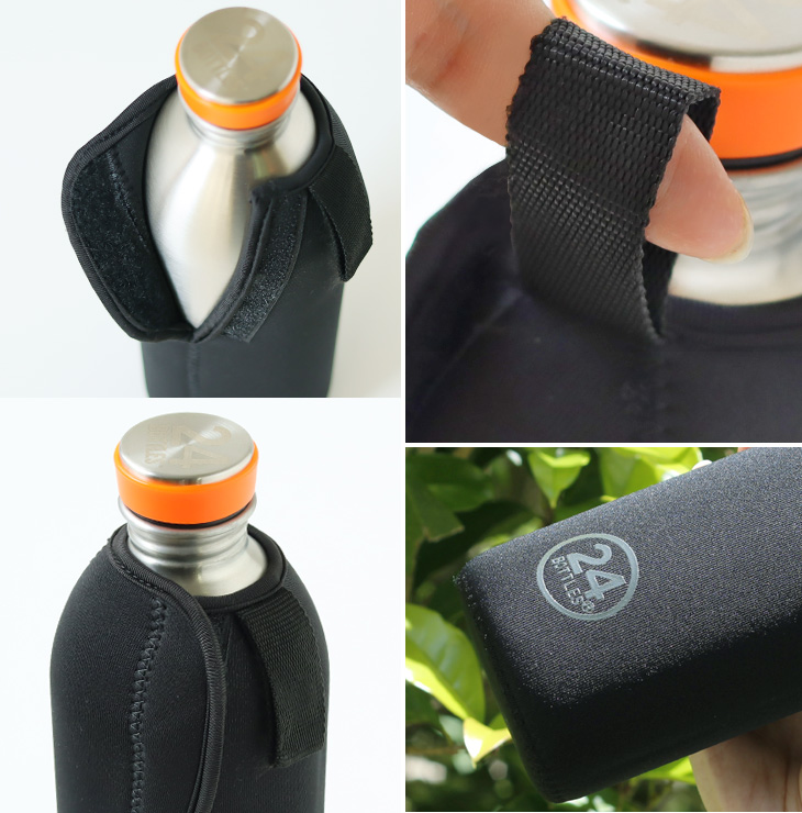 柔らかいけどしっかりとしているクロロプレンゴム製の生地。 上部マジックテープ横には使い勝手の良いループが付いていますので、バッグにボトルを取り付けることも可能♪ 正面には24Bottlesのロゴがプリントされており、光の当たる加減で浮き上がります。