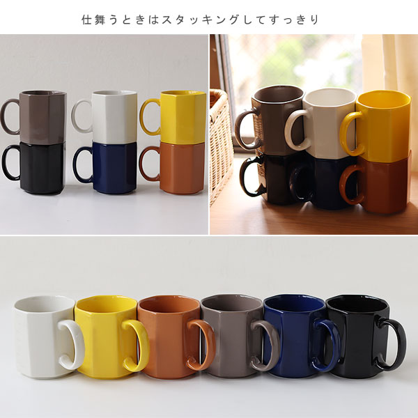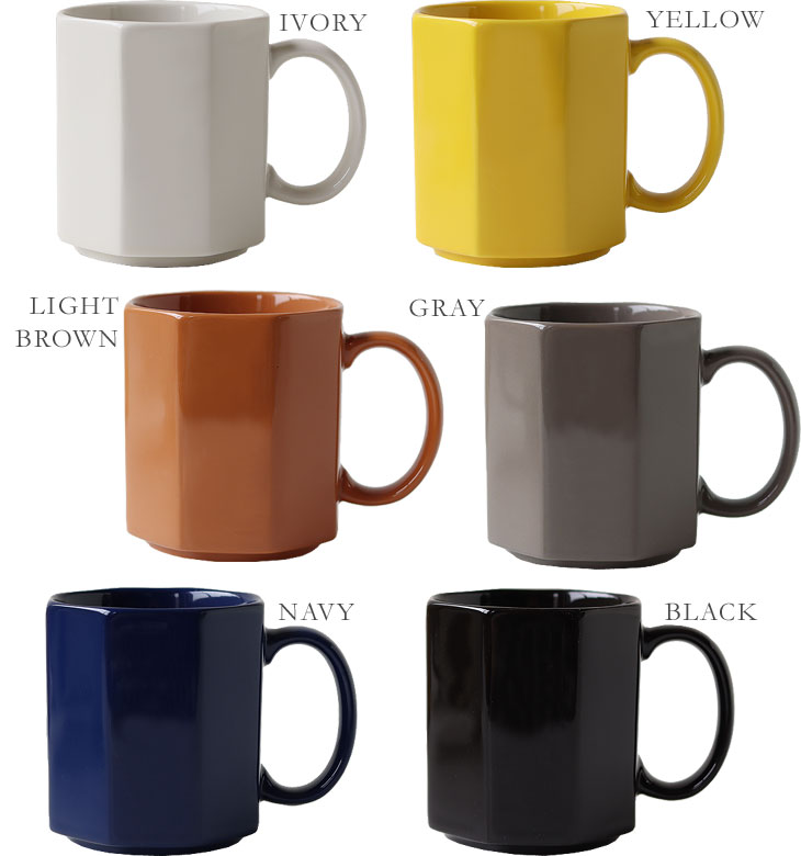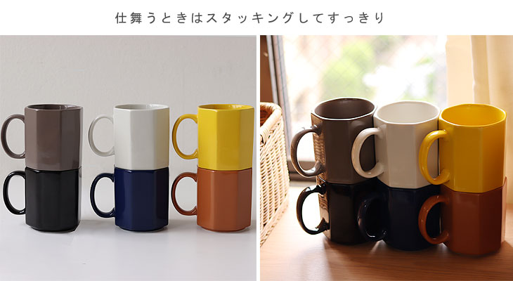 厳選した6カラー展開。 性別を問わず、さまざまなインテリアで使ってもらいたいと、ベーシックから明るいものまで幅広いカラーを取り揃えました。 アイボリー、イエロー、ライトブラウン、グレー、ネイビー、ブラックと、使う方の好みのカラーに合わせて複数揃えるのもおすすめです。 ![]() 底部分が噛み合うスタッキングできる仕様なので、使わないときは食器棚に重ねて仕舞うことでいつでもすっきりと収納できます。 電子レンジや食洗機にも対応しているのも日常的な使い勝手を考えた仕上げです。